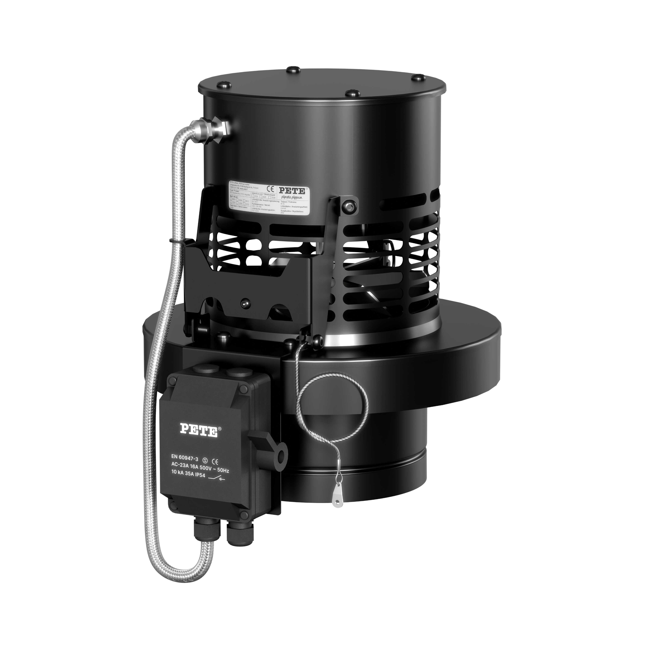 Savukaasuimurin mekaaninen kiinnitys teräshormin päähän käy nopeasti ja helposti. Kiinnittämisen yhteydessä huomioi savukaasuimurin saranoinnin aukeamissuunta. PETE-savukaasuimurin lopulliset sähkökytkennät saa suorittaa vain sähköluvat omaava sähköasentaja.